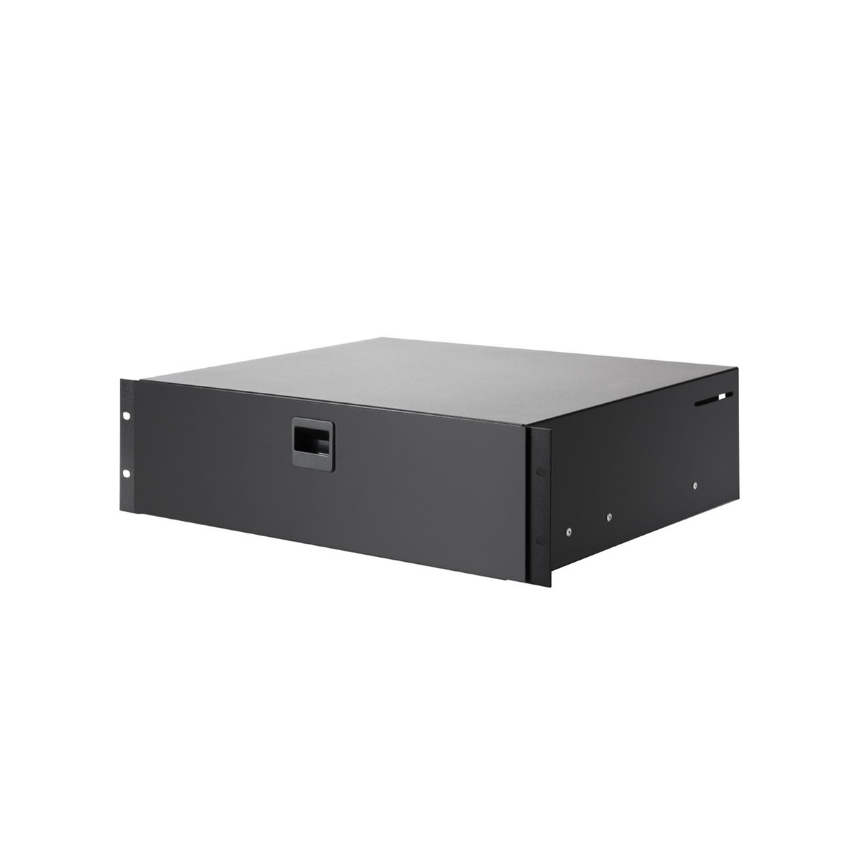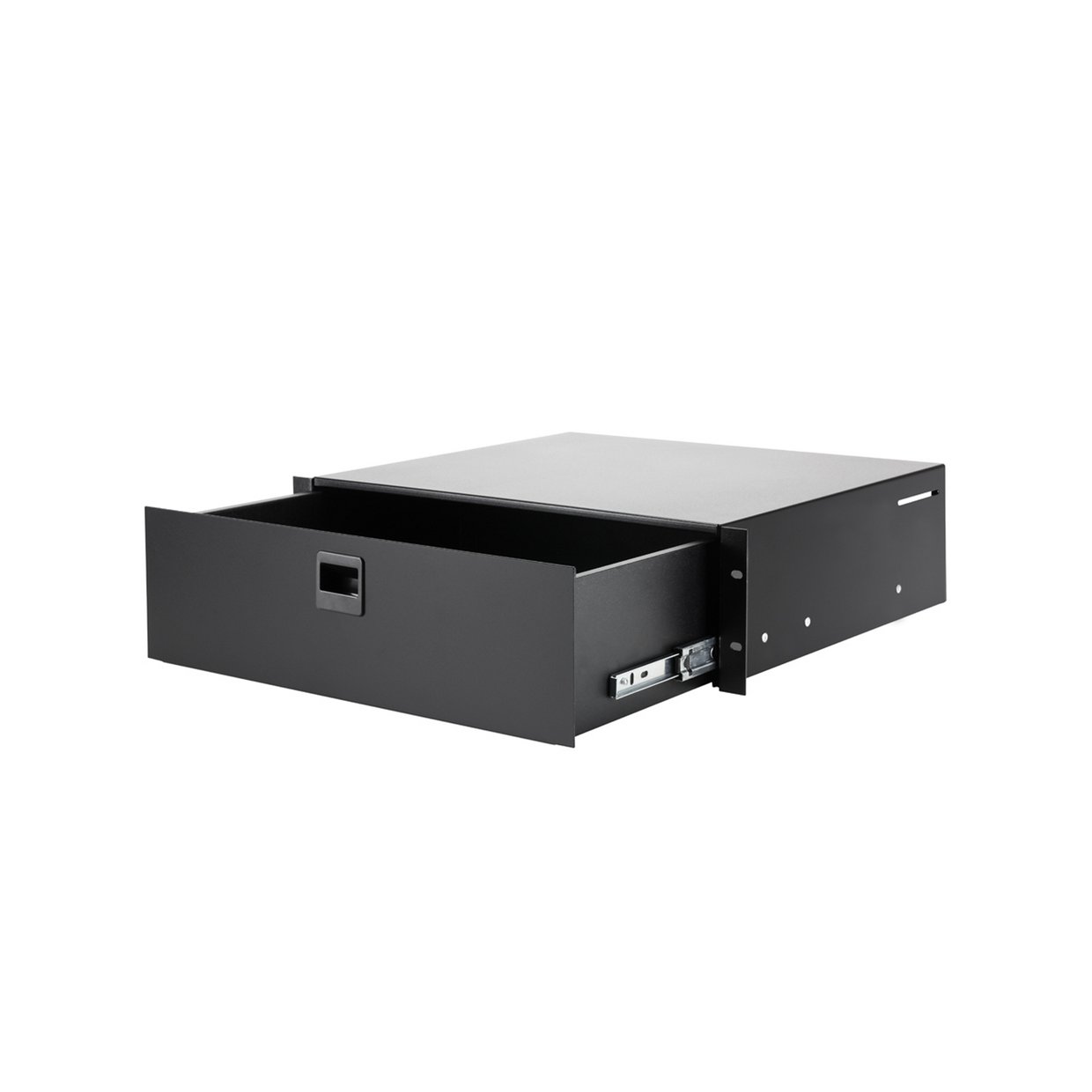 מגירת Rack 19 אינץ מסדרת ECONOMY בגובה 3U, מיועדת להתקנה בארונות ראק סטנדרטיים. המגירה עשויה פלדה עם ציפוי אבקה שחור, וכוללת מנגנון נעילה בלשונית למניעת פתיחה לא רצויה בזמן הובלה. פתיחה על גבי מסילה טלסקופית עם מיסב כדורי, מאפשרת שליפה חלקית עד שלושה רבעים מאורכה ונוחות גישה לציוד. פותחה ותוכננה על ידי צוות Adam Hall 19 Parts בגרמניה.